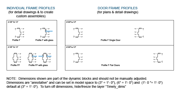 NOTE: Dimensions shown are part of the dynamic blocks and should not be manually adjusted. Dimensions are “annotative” and can be set in model space to (3″ = 1′ – 0″ default), (6″ = 1′ – 0″) and (1′ – 0″ = 1′ – 0″).