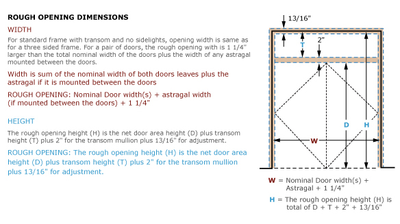 ROUGH OPENING: The rough opening height (H) is the net door area height (D) plus transom height (T) plus 2" for the transom mullion plus 13/16" for adjustment.