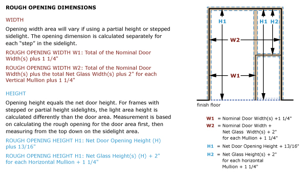 Opening height equals the net door height. For frames with stepped or partial height sidelights, the light area height is calculated differently than the door area. Measurement is based on calculating the rough opening for the door area first, then measuring from the top down on the sidelight area.