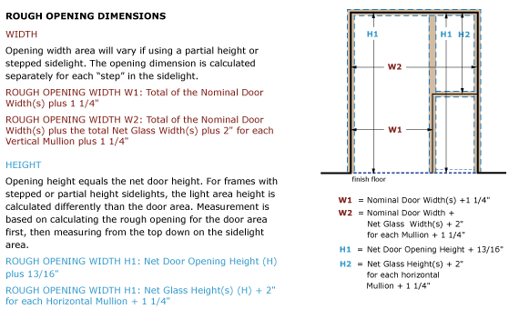 ROUGH OPENING WIDTH W2: Total of the Nominal Door Width(s) plus the total Net Glass Width(s) plus 2" for each Vertical Mullion plus 1 1/4"